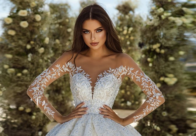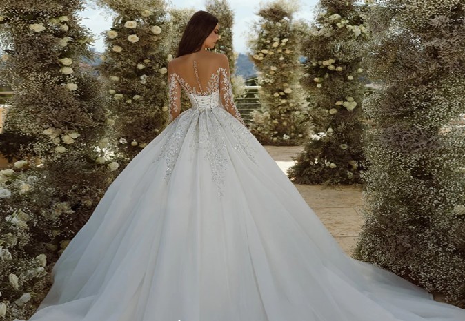 Einführung » Brautmode Kollektion 2025 2026 » A-Linie Prinzessinnen Brautkleid Erika mit Illusion Ausschnitt Tattoo Spitze und Schleppe