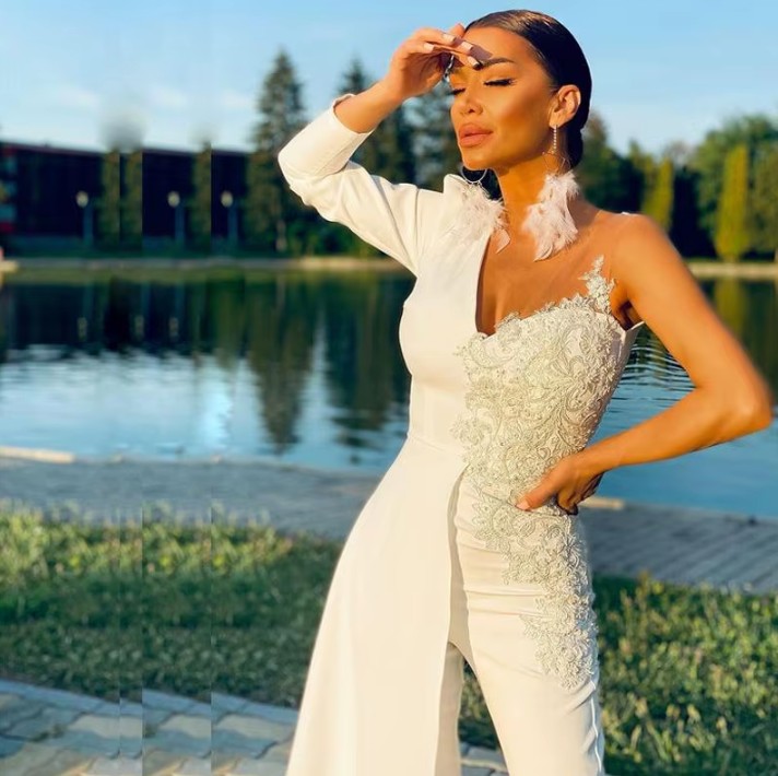 Einführung » Standesamt Brautkleider 2025 » Braut Einteiler Jumpsuit für den Standesamt Asymmetrisch in Weiß