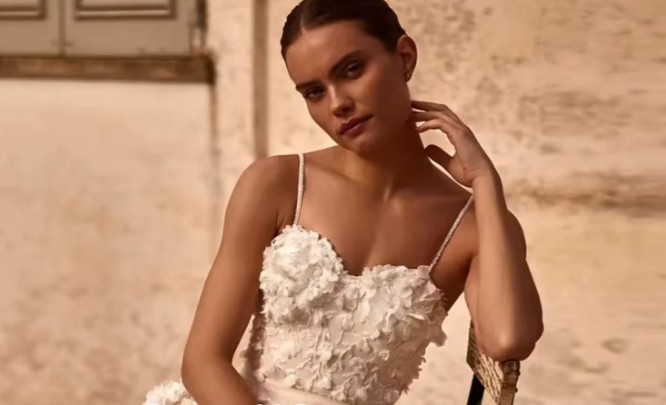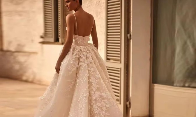 Einführung » Brautmode Kollektion 2025 2026 » Spaghettiträger Luxus Brautkleid Eliane Rückenfrei mit 3D Blumen und Schleppe